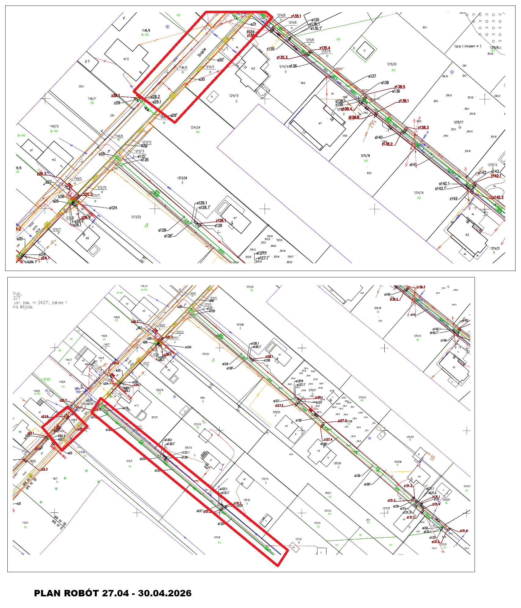 Informujemy iż Wykonawca inwestycji w ramach projektu pn: " Budowa sieci kanalizacji sanitarnej w miejscowości Zendek-Strąków", przedstawił planowany zakres robót w dniach od 27.04.2026 r. do 30.04.2026 r., zgodnie z poniższym załącznikiem mapowym.
